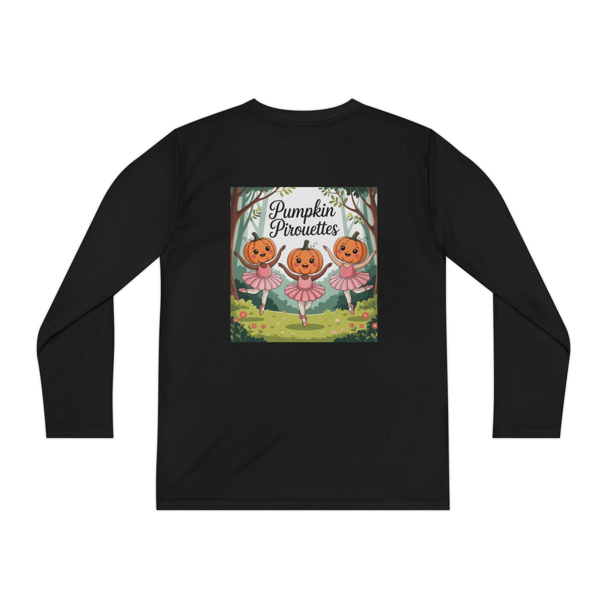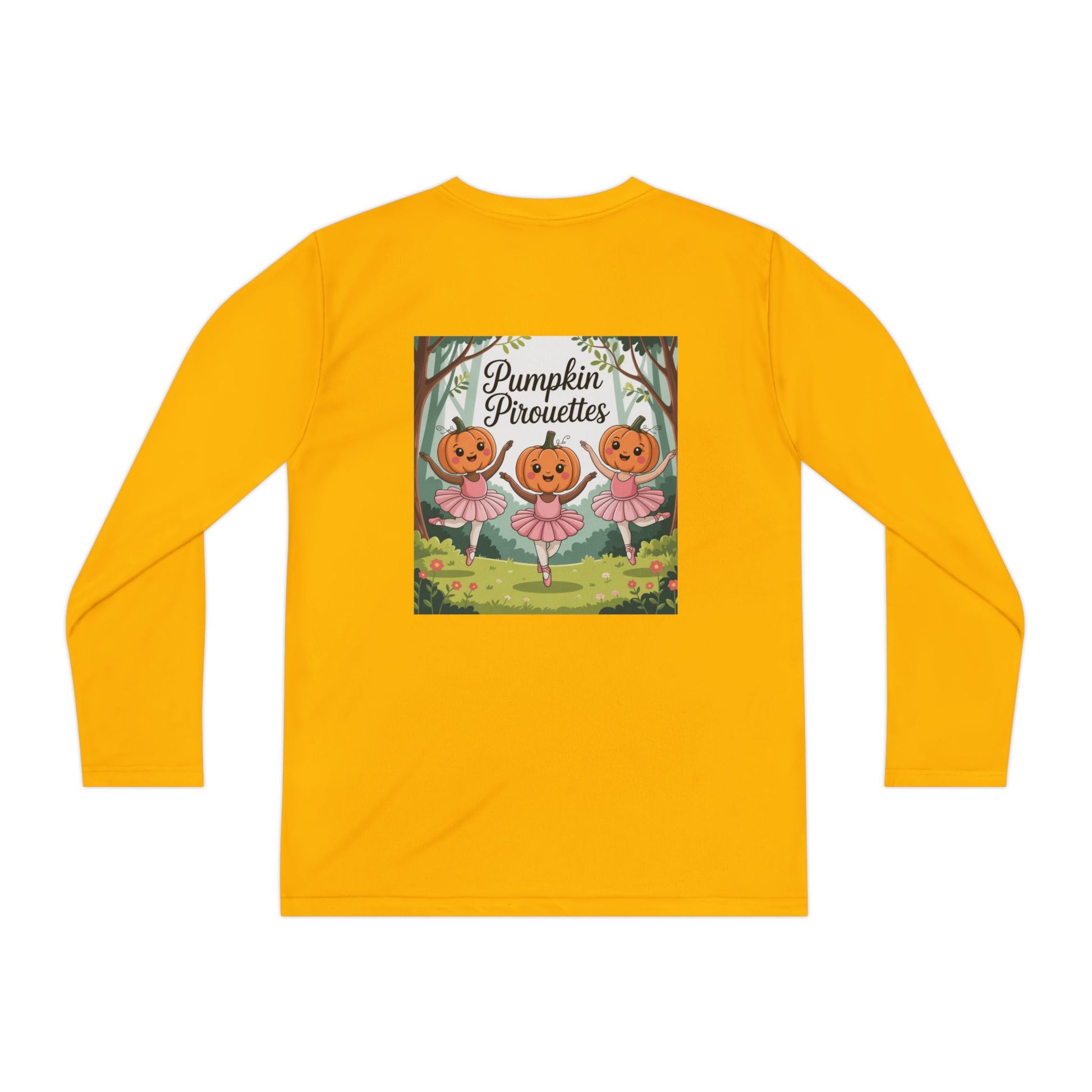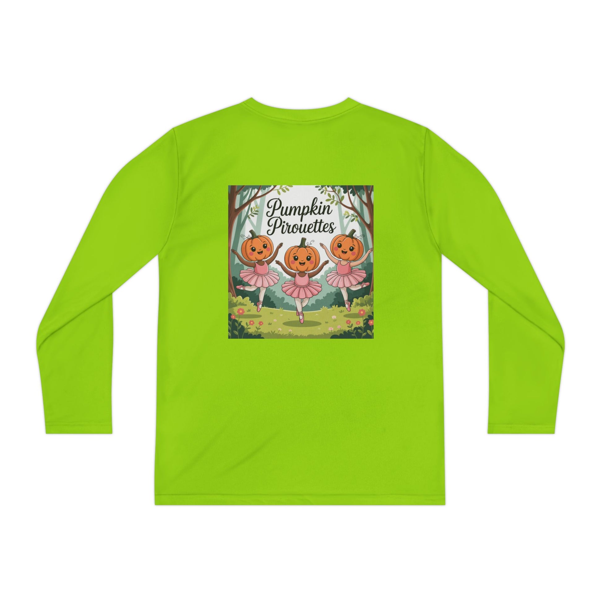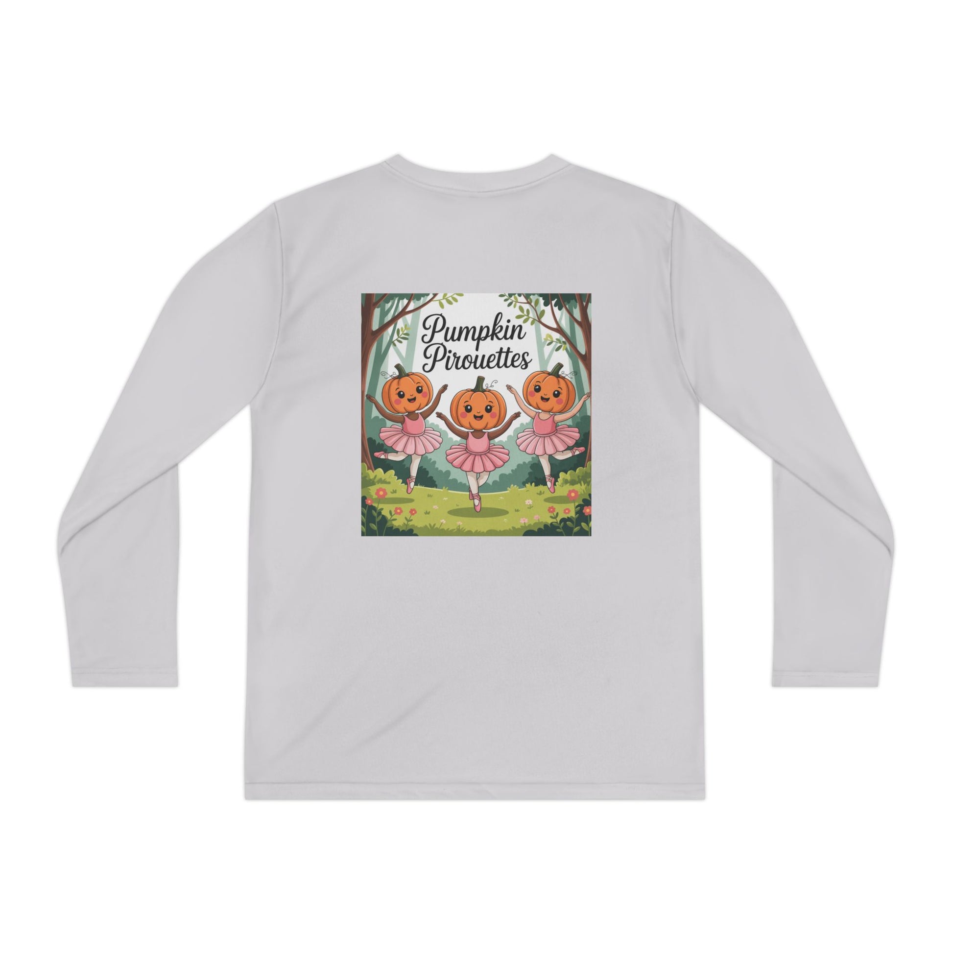Pumpkin Pirouettes Youth Long Sleeve Tee perfect for Halloween festivities and fall season, ideal for kids as a costume top or dance apparel. This shirt is made of 100% moisture-wicking polyester, featuring a direct-to-film print for a durable design.