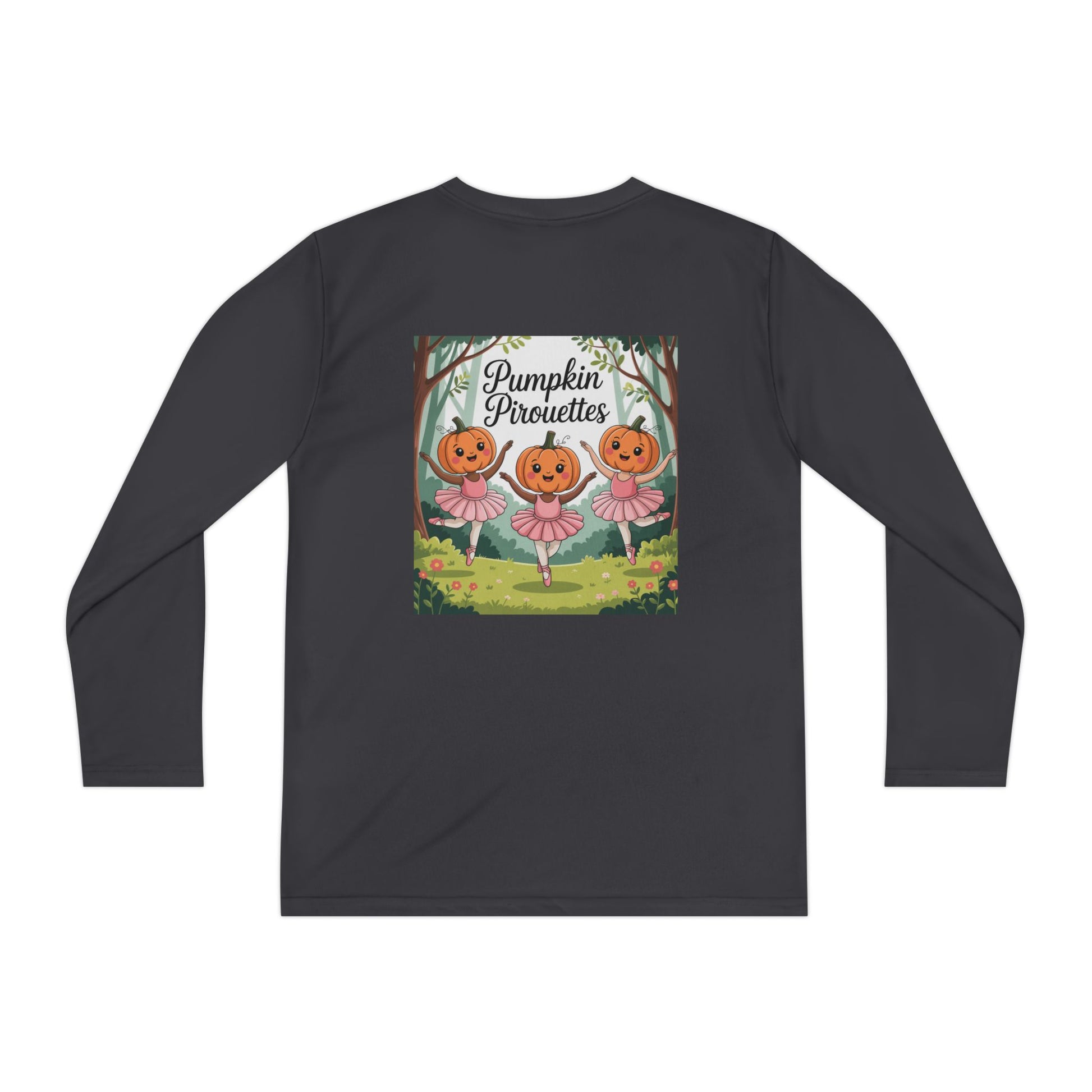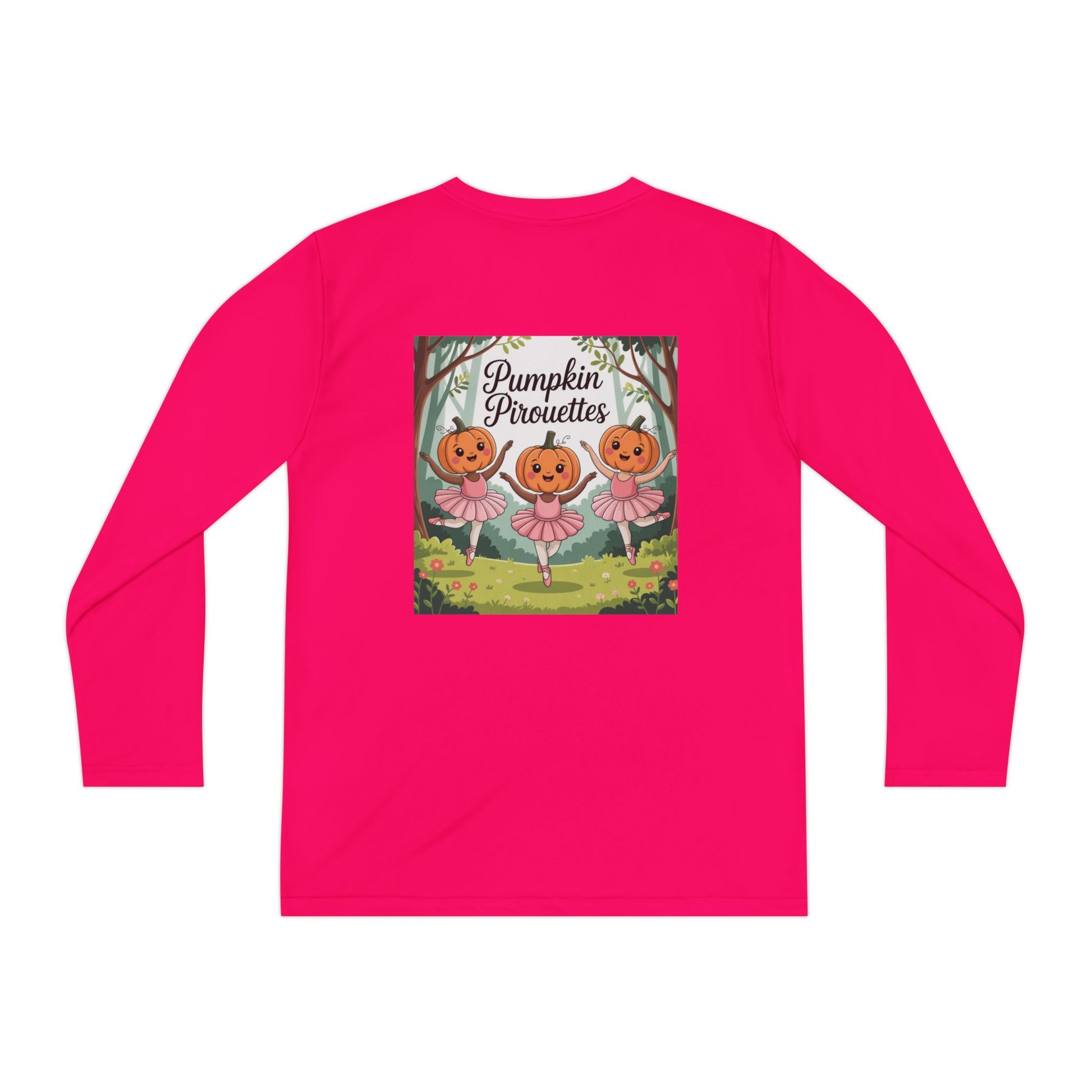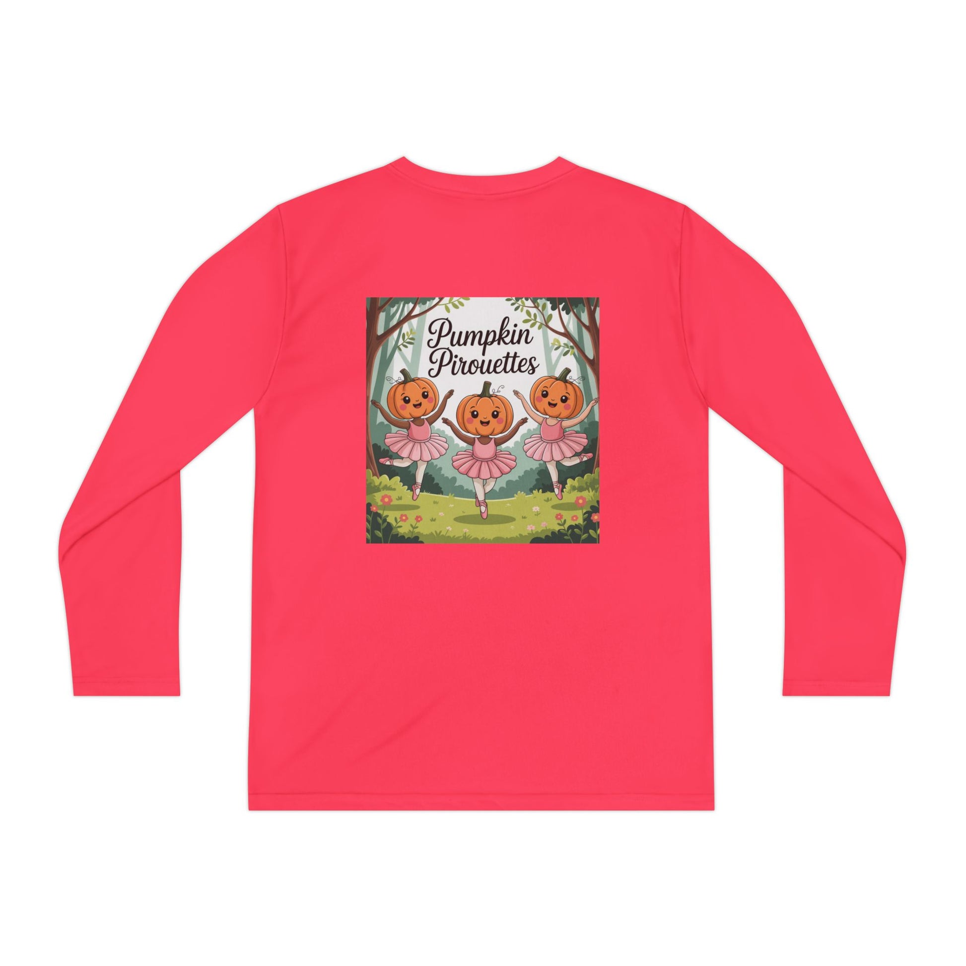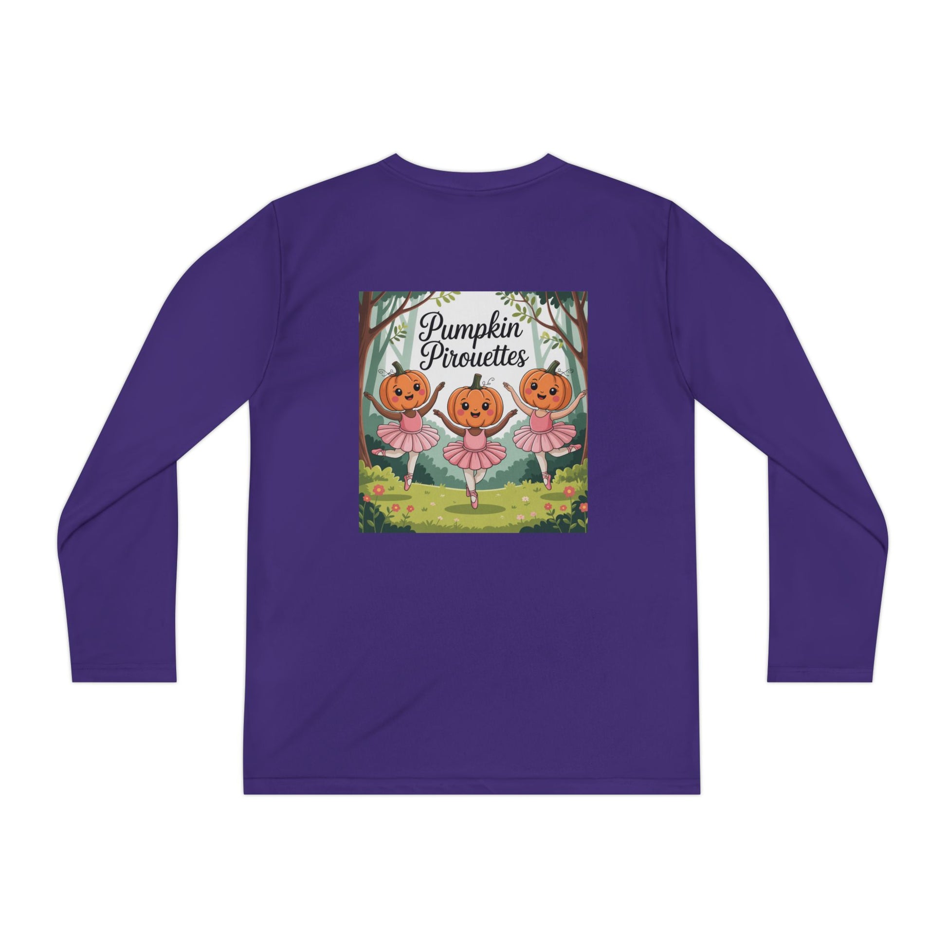 Pumpkin Pirouettes Youth Long Sleeve Tee perfect for Halloween festivities and fall season, ideal for kids as a costume top or dance apparel. This shirt is made of 100% moisture-wicking polyester, featuring a direct-to-film print for a durable design.