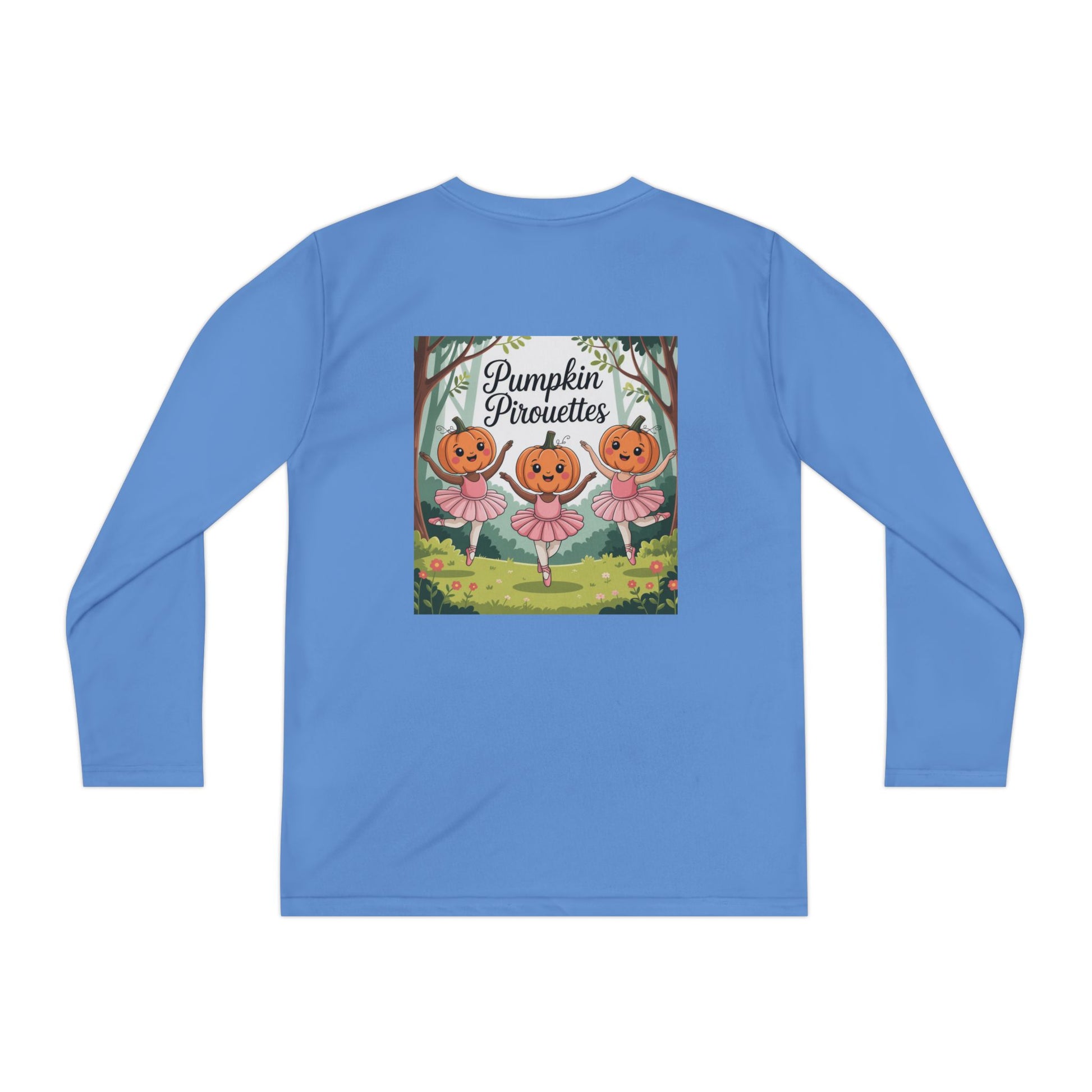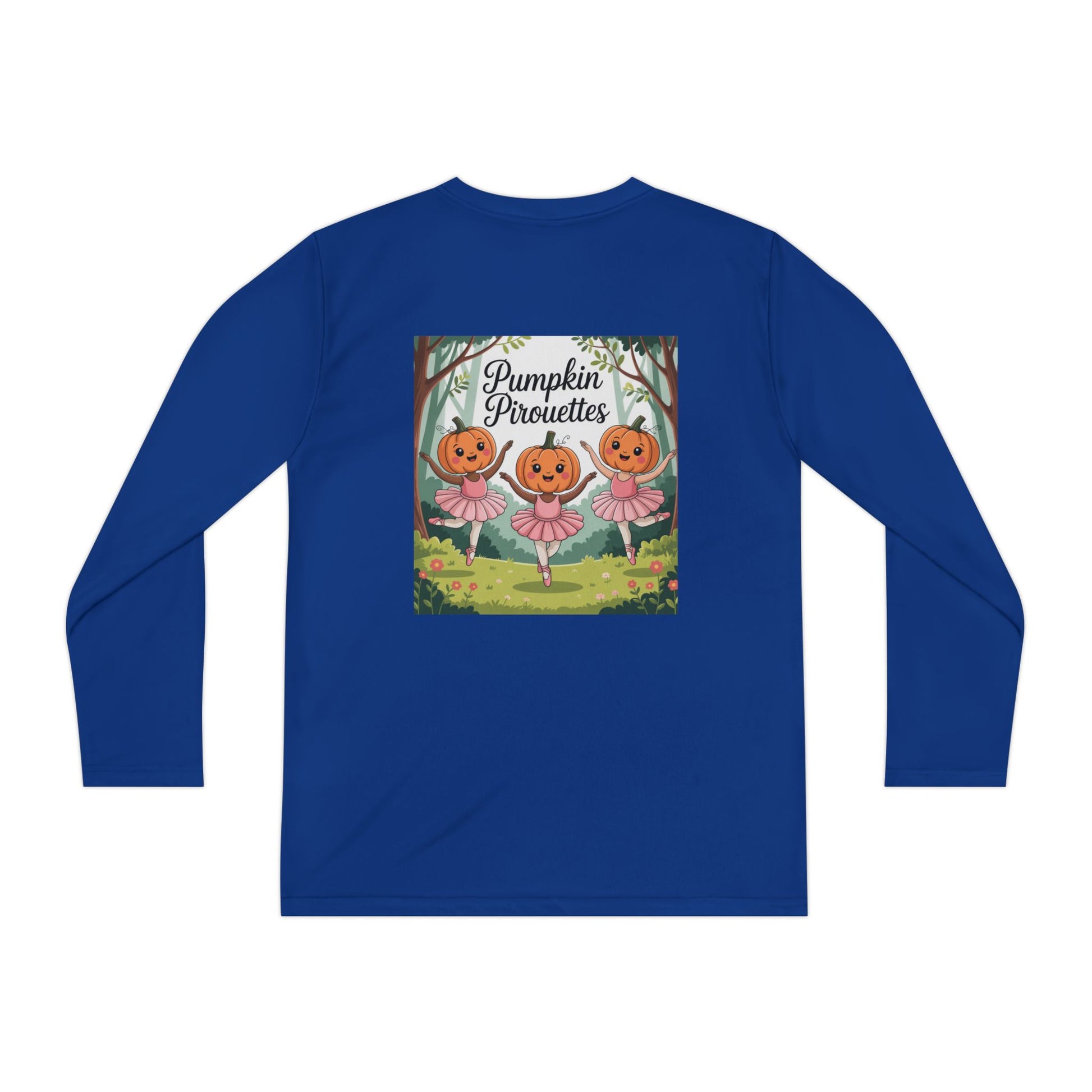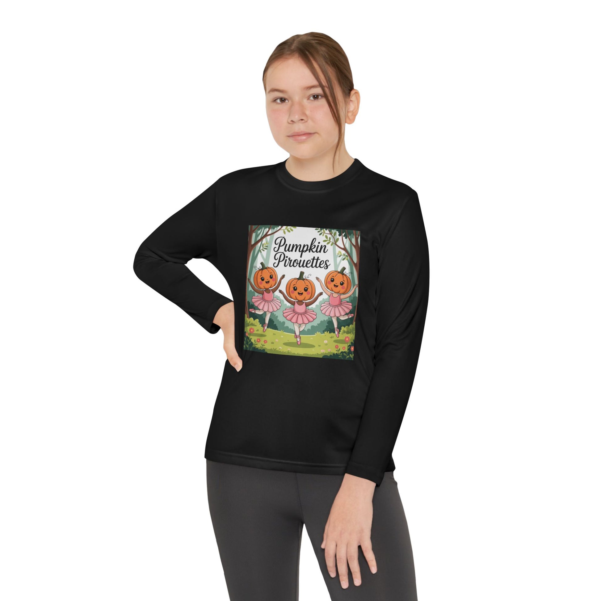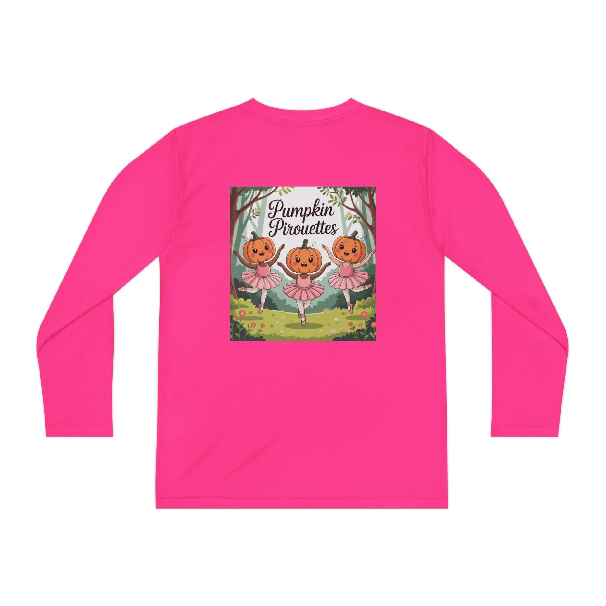 Pumpkin Pirouettes Youth Long Sleeve Tee perfect for Halloween festivities and fall season, ideal for kids as a costume top or dance apparel. This shirt is made of 100% moisture-wicking polyester, featuring a direct-to-film print for a durable design.