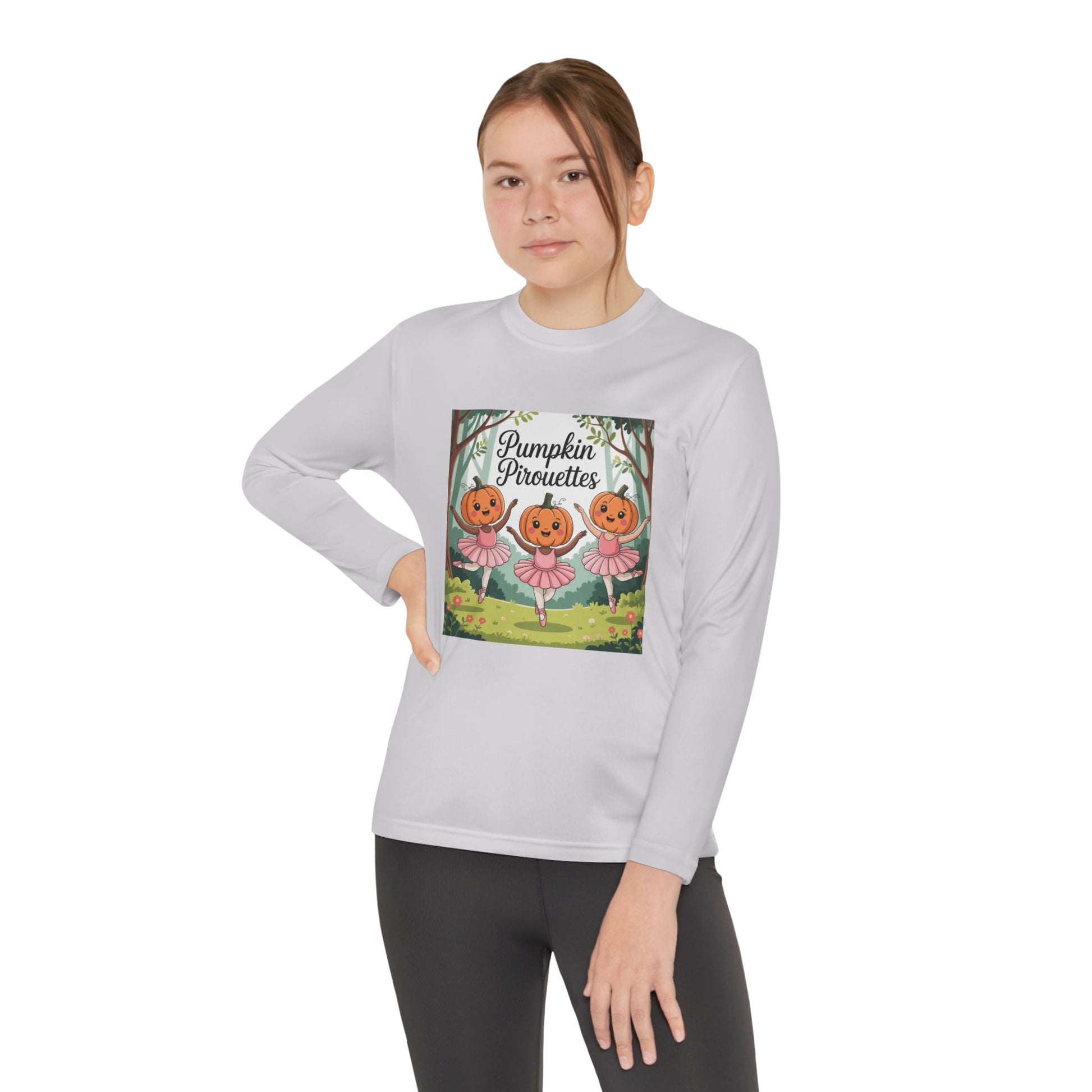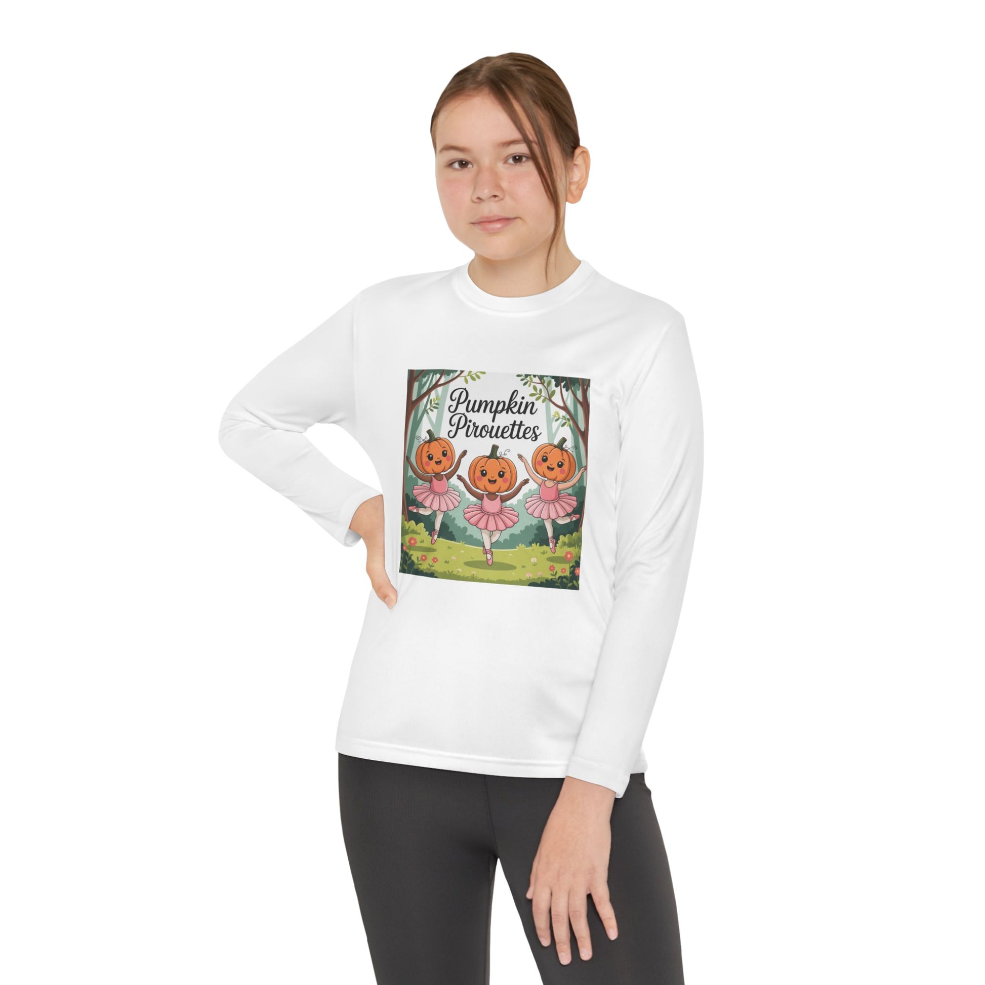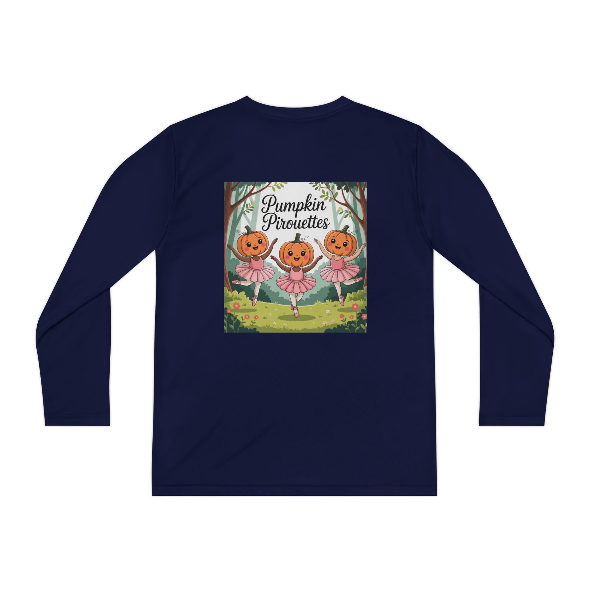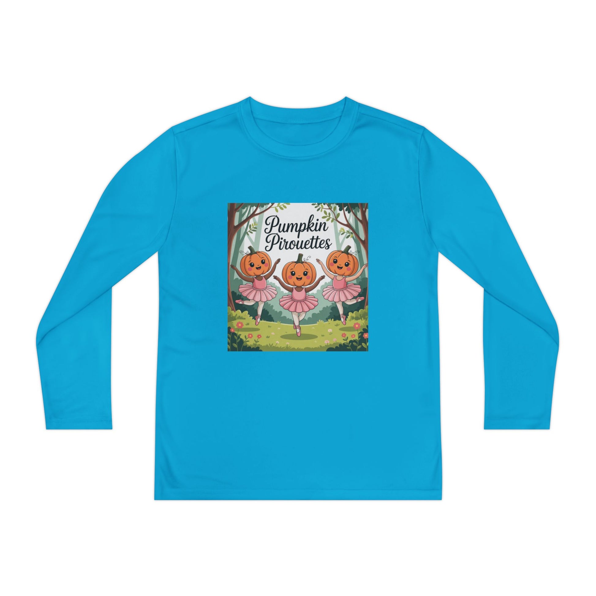 Pumpkin Pirouettes Youth Long Sleeve Tee perfect for Halloween festivities and fall season, ideal for kids as a costume top or dance apparel. This shirt is made of 100% moisture-wicking polyester, featuring a direct-to-film print for a durable design.