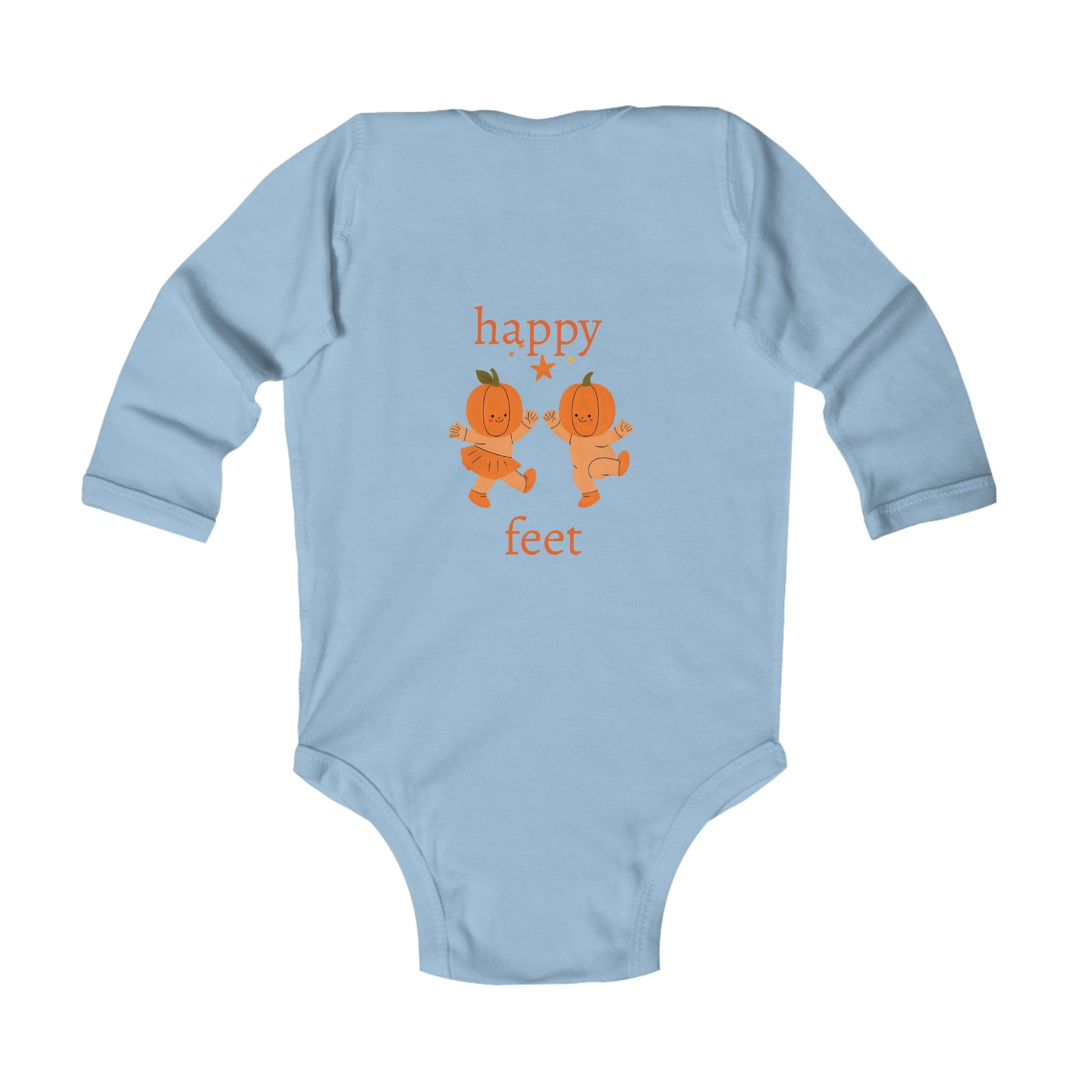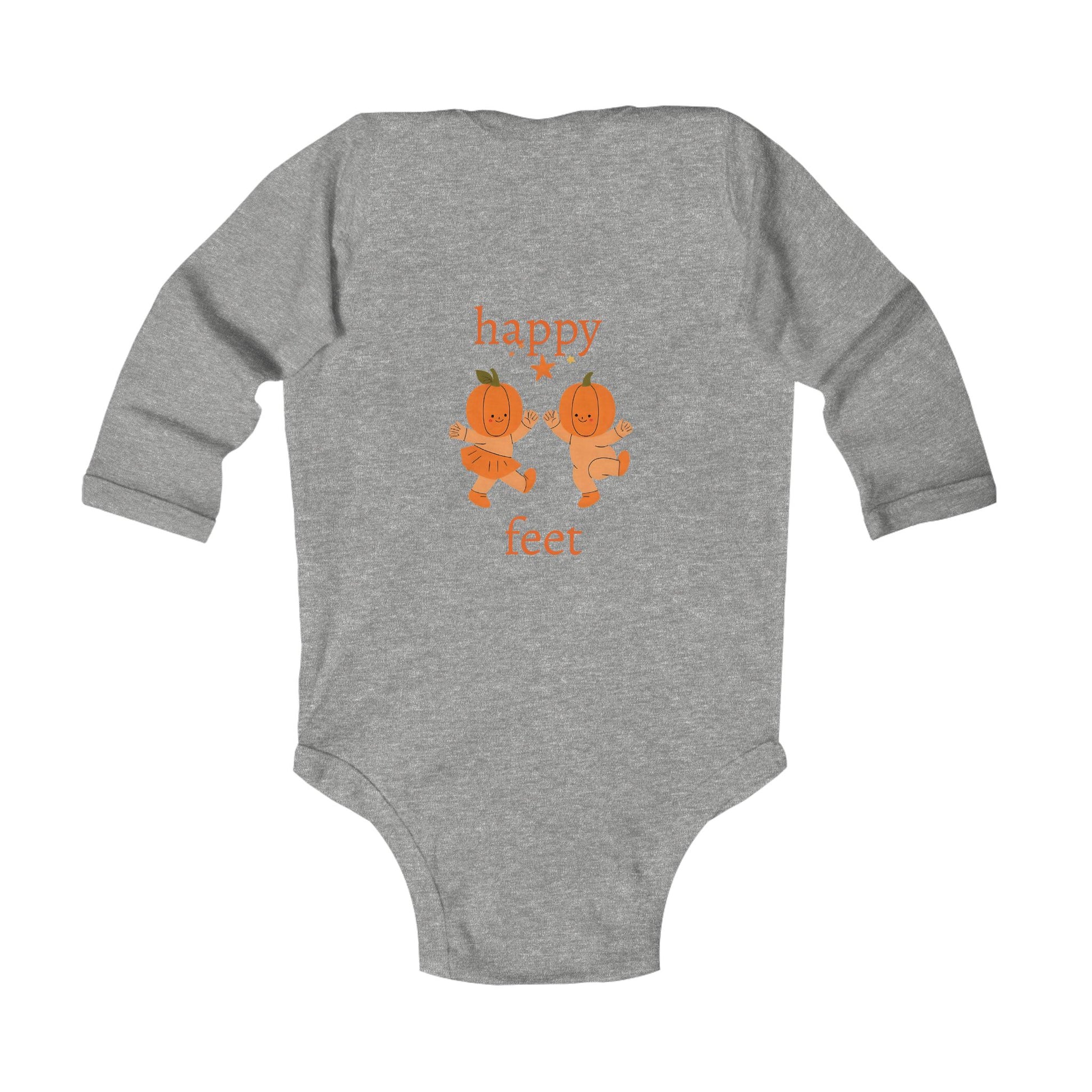 The Happy Feet Pumpkin Onesie is a delightful and festive infant long sleeve bodysuit perfect for the fall season. With its cute pumpkin design, it exudes a cozy and playful vibe, making it ideal for babies during Halloween and Thanksgiving.