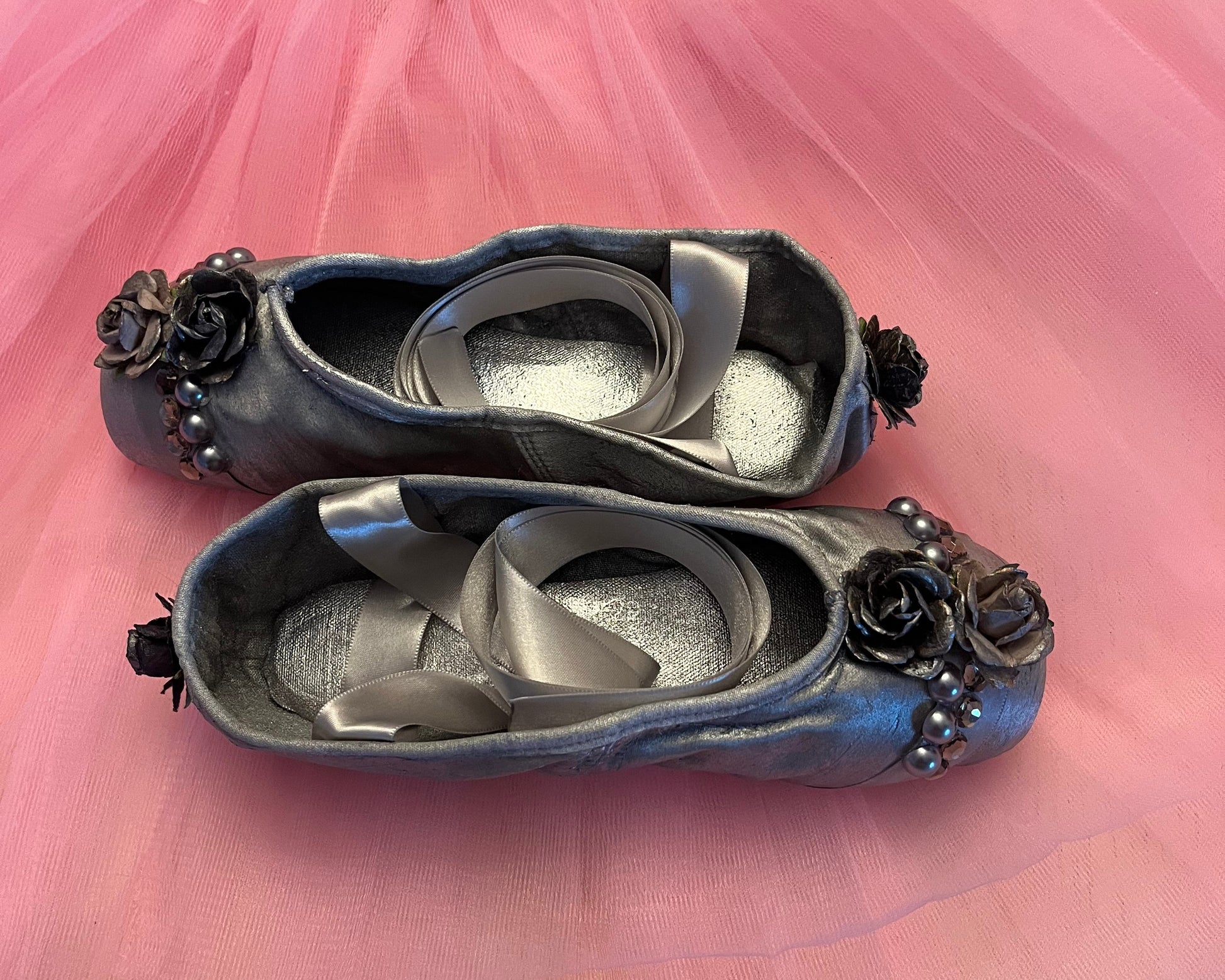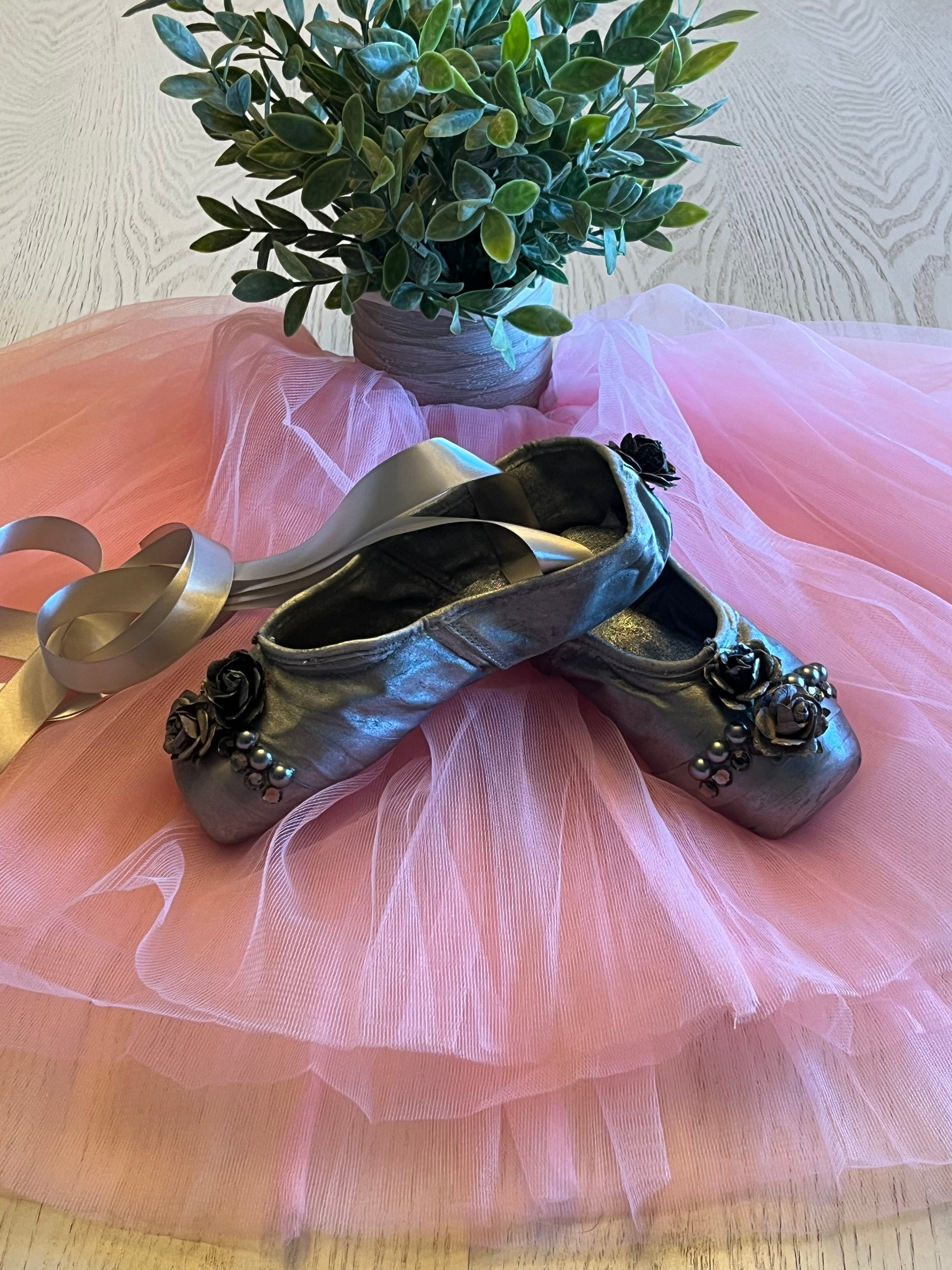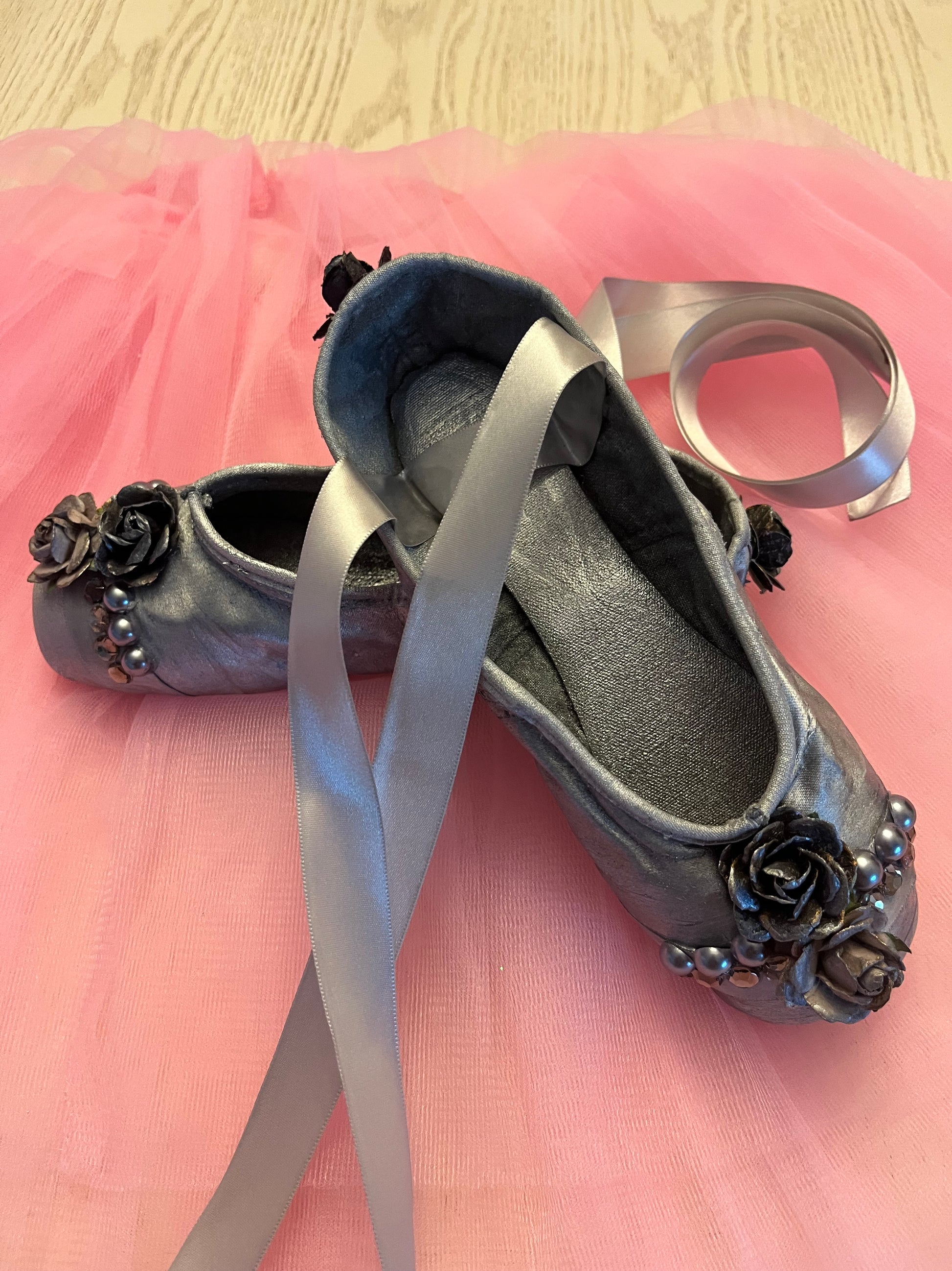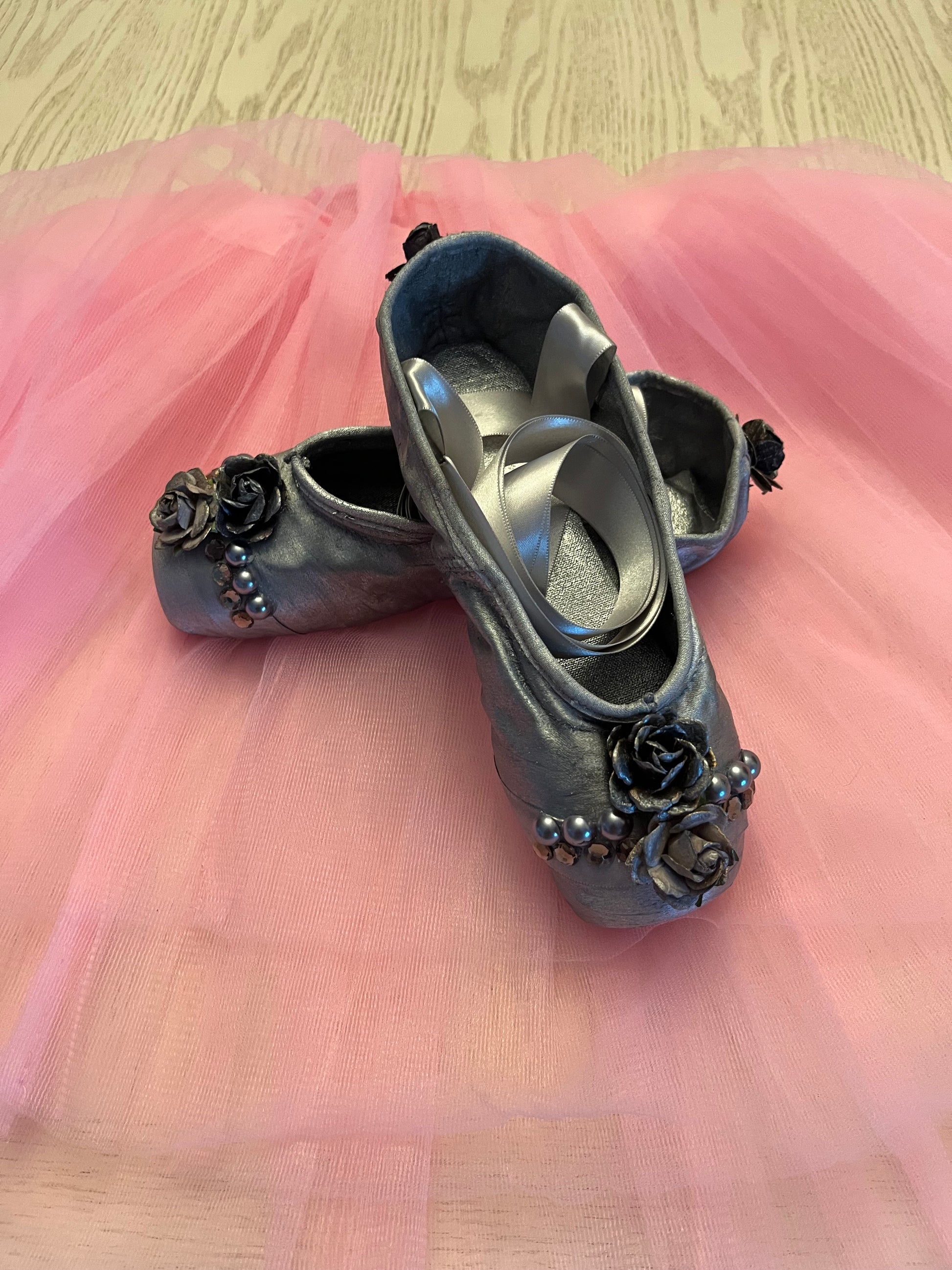 Midnight Serenade,  captures the haunting elegance of twilight — a satin pointe shoe painted in shades of silvery grey and adorned with silver toned roses, pearl studs, and smoky grey gems, each one affixed by hand with intricate care.