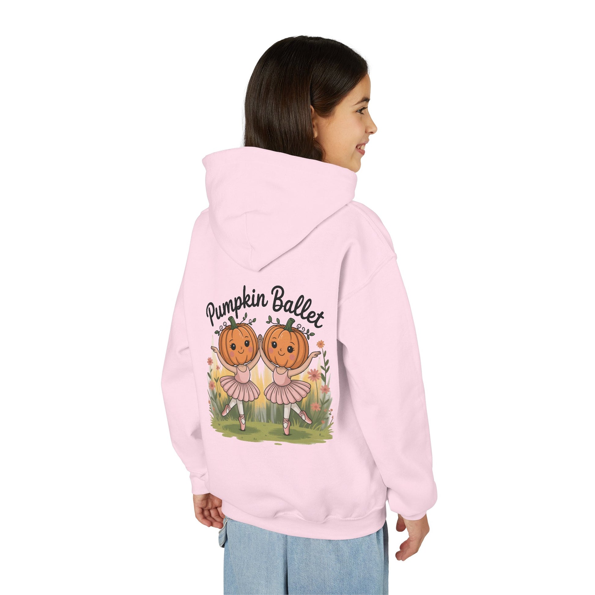 This Pumpkin Ballet Youth Sweatshirt is the perfect Halloween costume for your little dancer. With a cute design and fall fashion vibe, this kids' hoodie is great for dance apparel. Keep your hands warm in the spacious kangaroo pouch pocket. Ideal for children, this sweatshirt is made from a blend of 50% cotton and 50% polyester, ensuring durability and comfort. Perfect for Halloween celebrations and fall festivities.