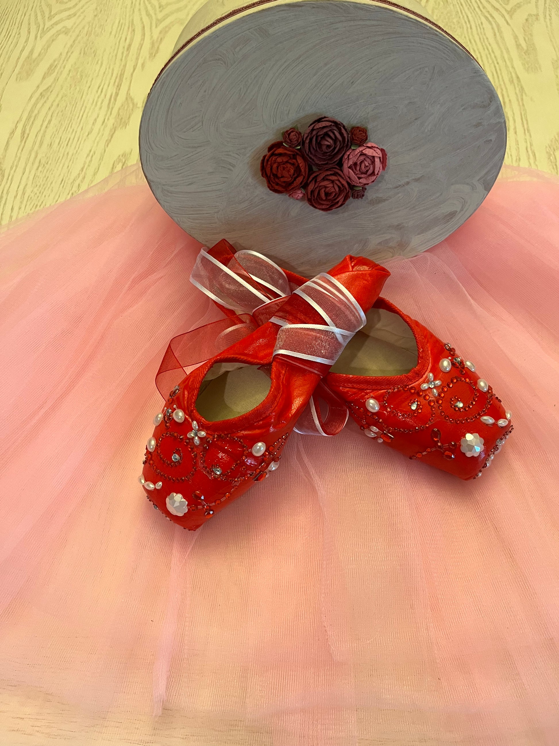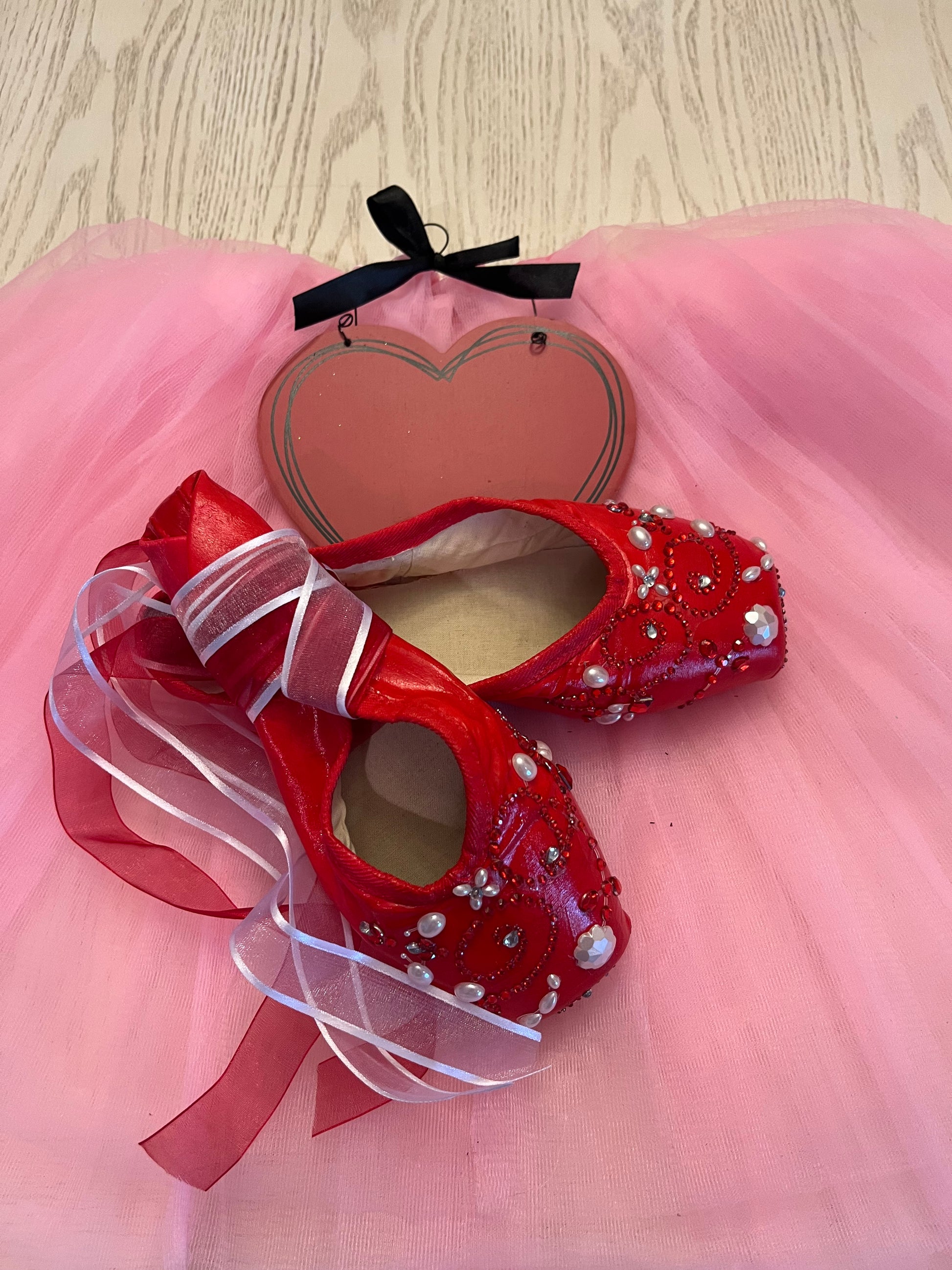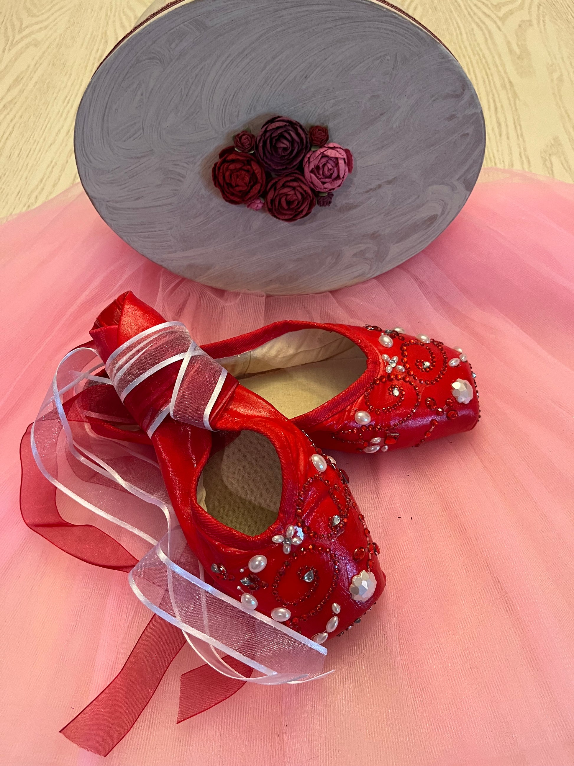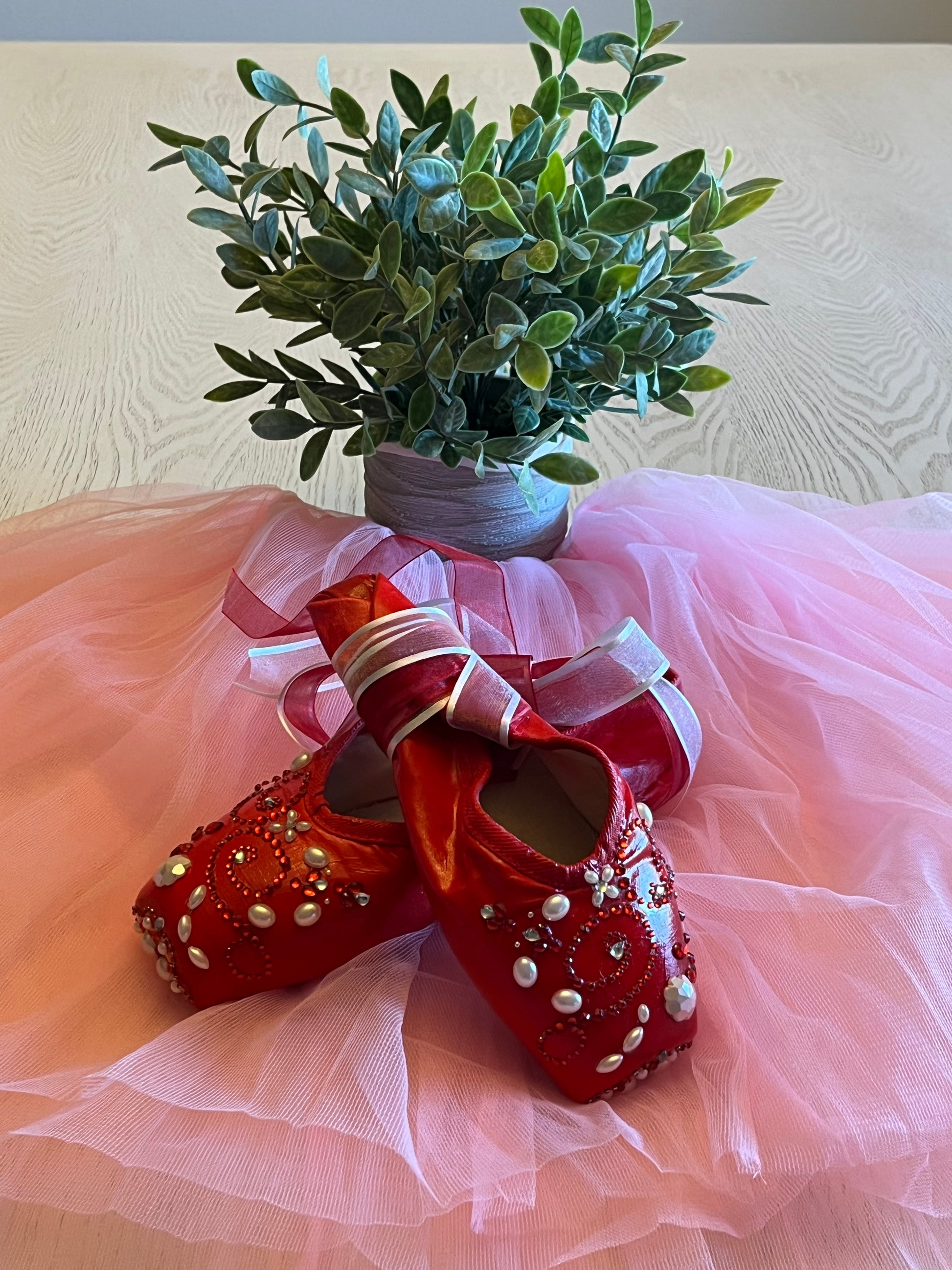 Red Rhapsody sings in color — a radiant satin pointe shoe, hand-painted in brilliant red and adorned with swirling white designs and luminous pearls. Each curve and embellishment is applied by hand, transforming this piece into a visual symphony of emotion and artistry.
