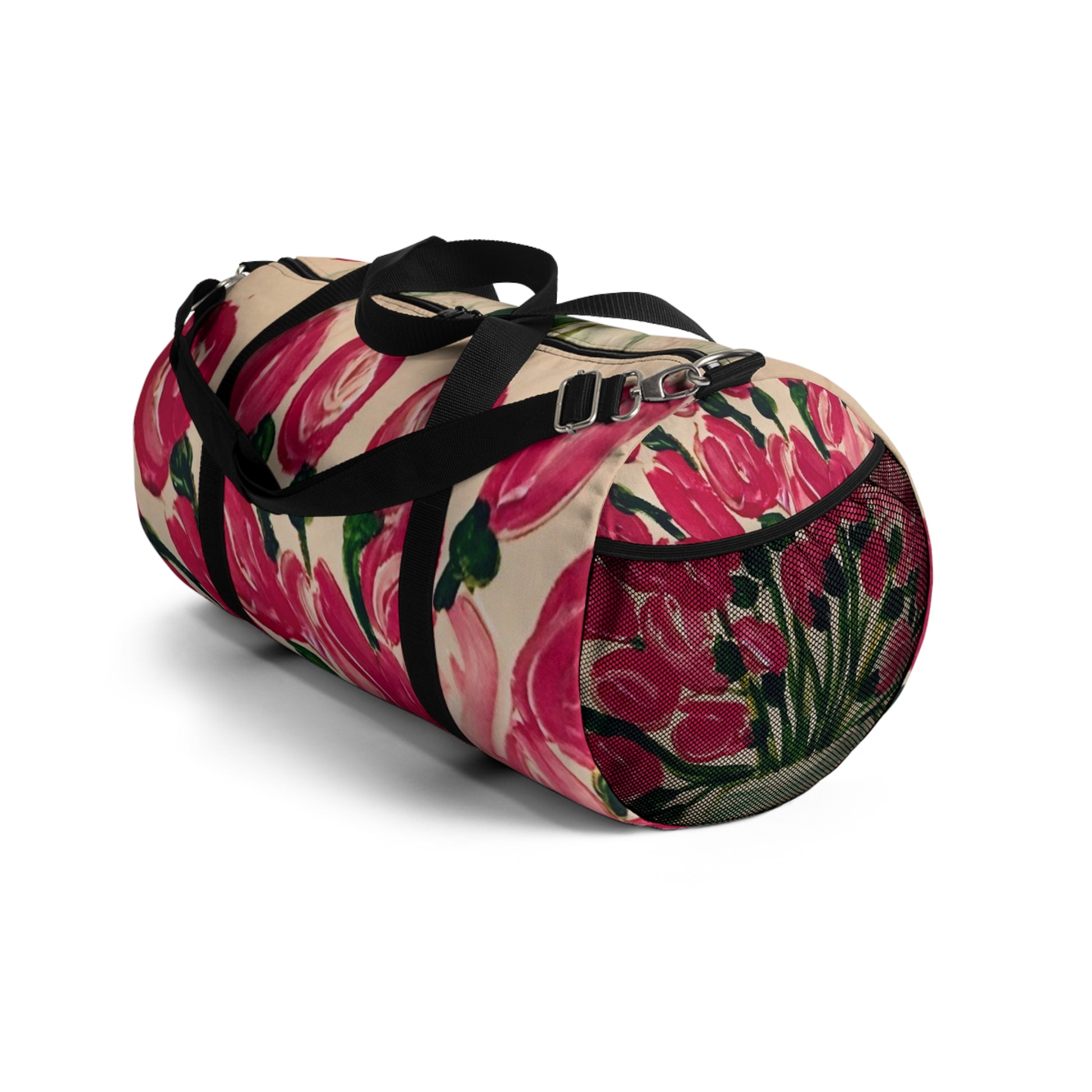 A stylish duffle bag featuring a design of pink tulips, perfect for the spring season. This bag radiates a fresh and floral vibe, ideal for those who love nature and feminine aesthetics. Great for dance class, weekend getaways, gym sessions, and travel adventures. Perfect gift for Mother's Day, Easter, or birthdays.