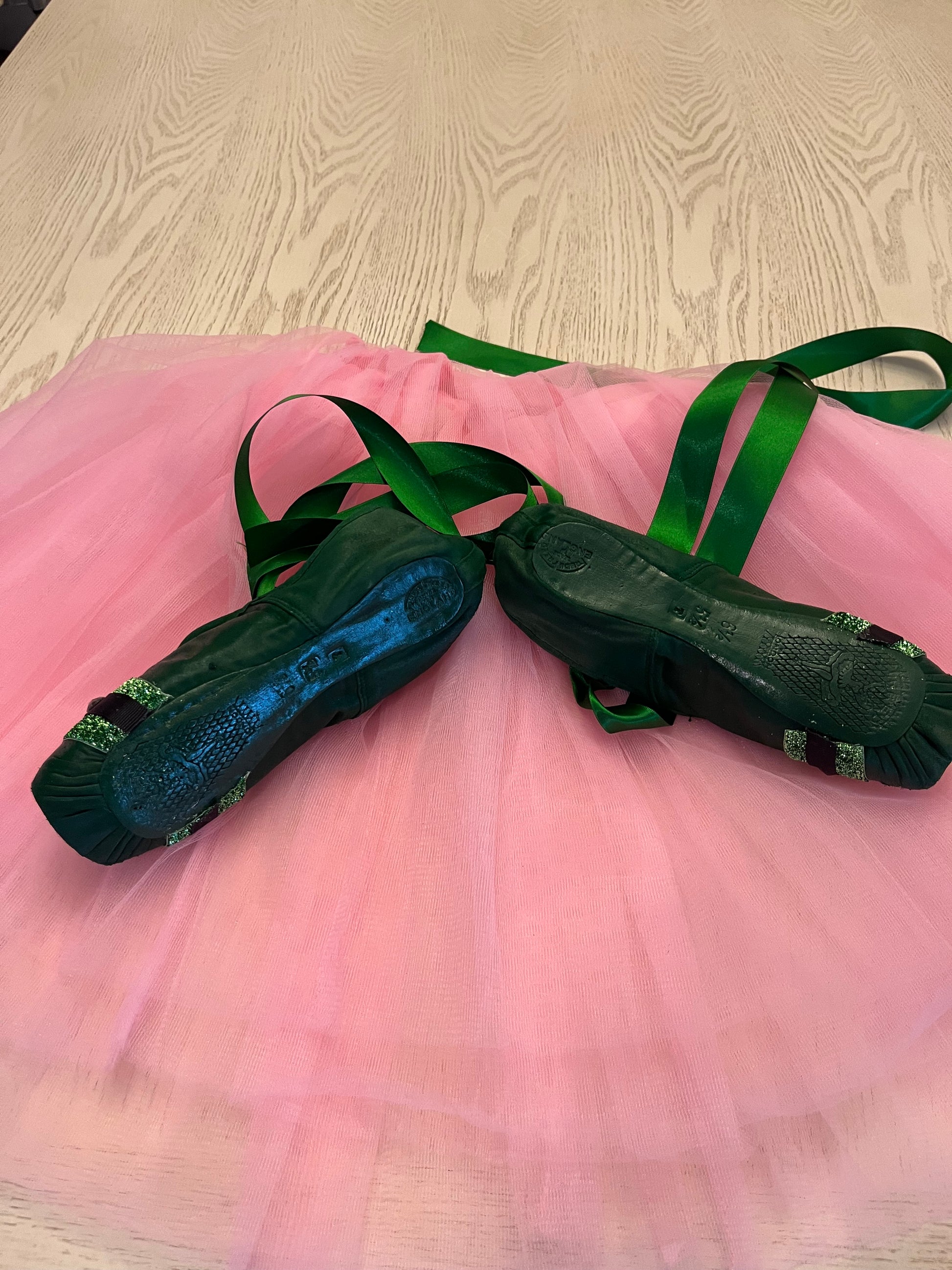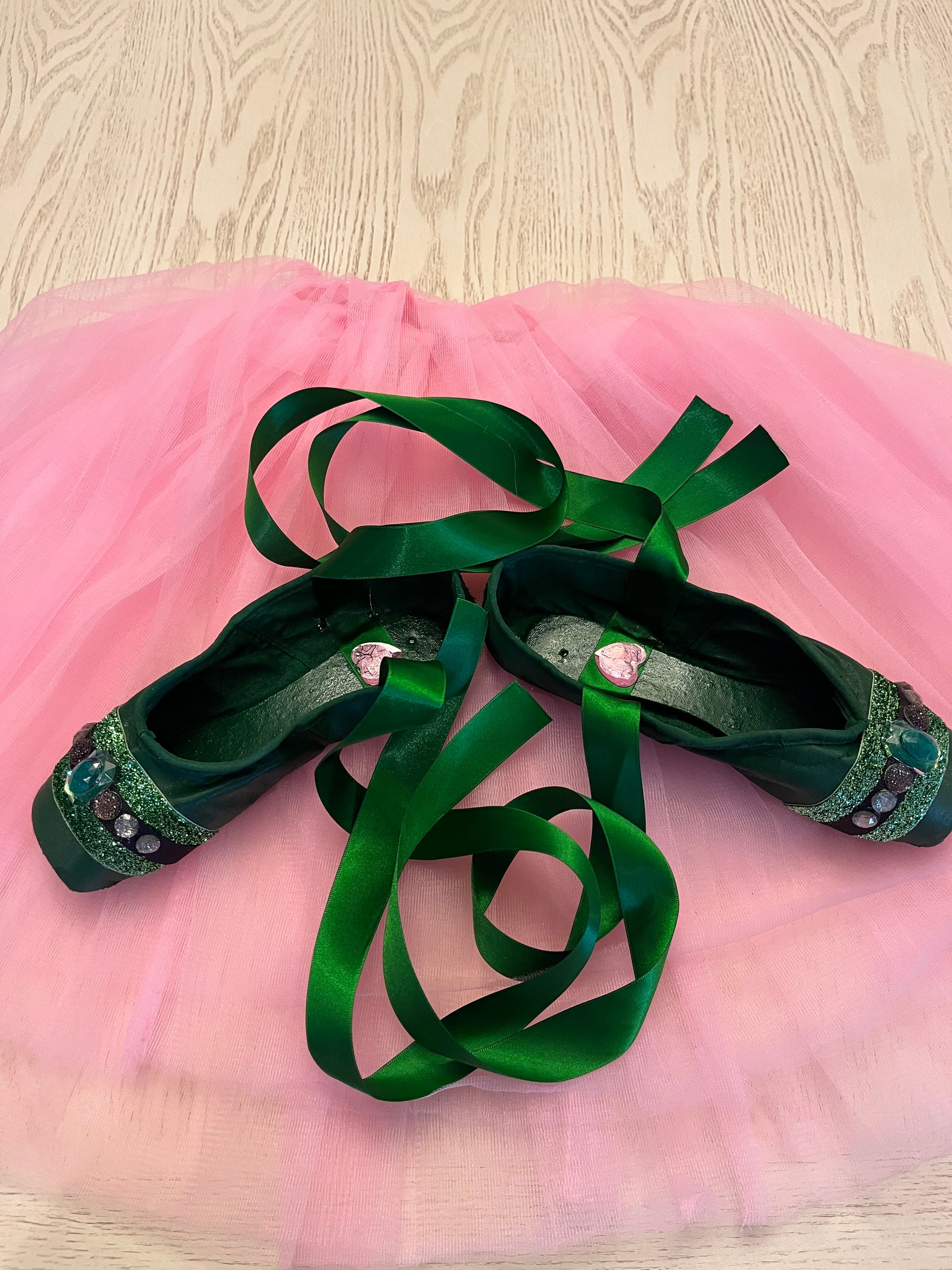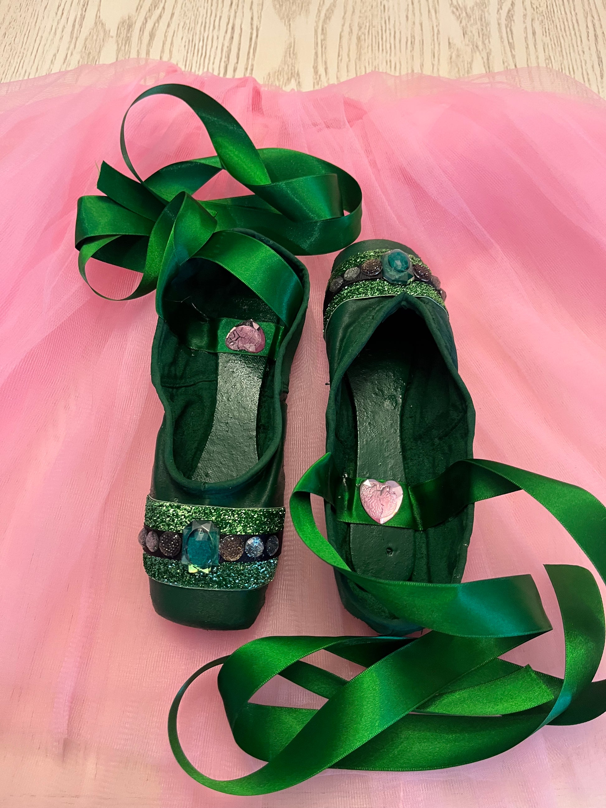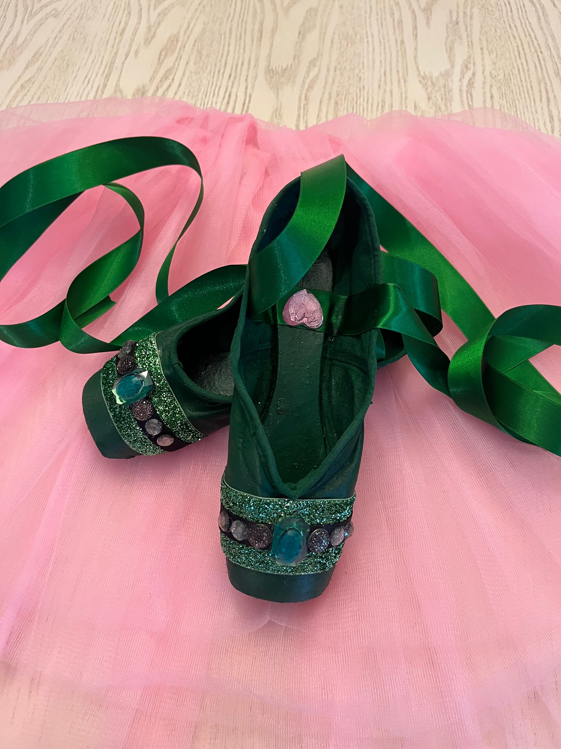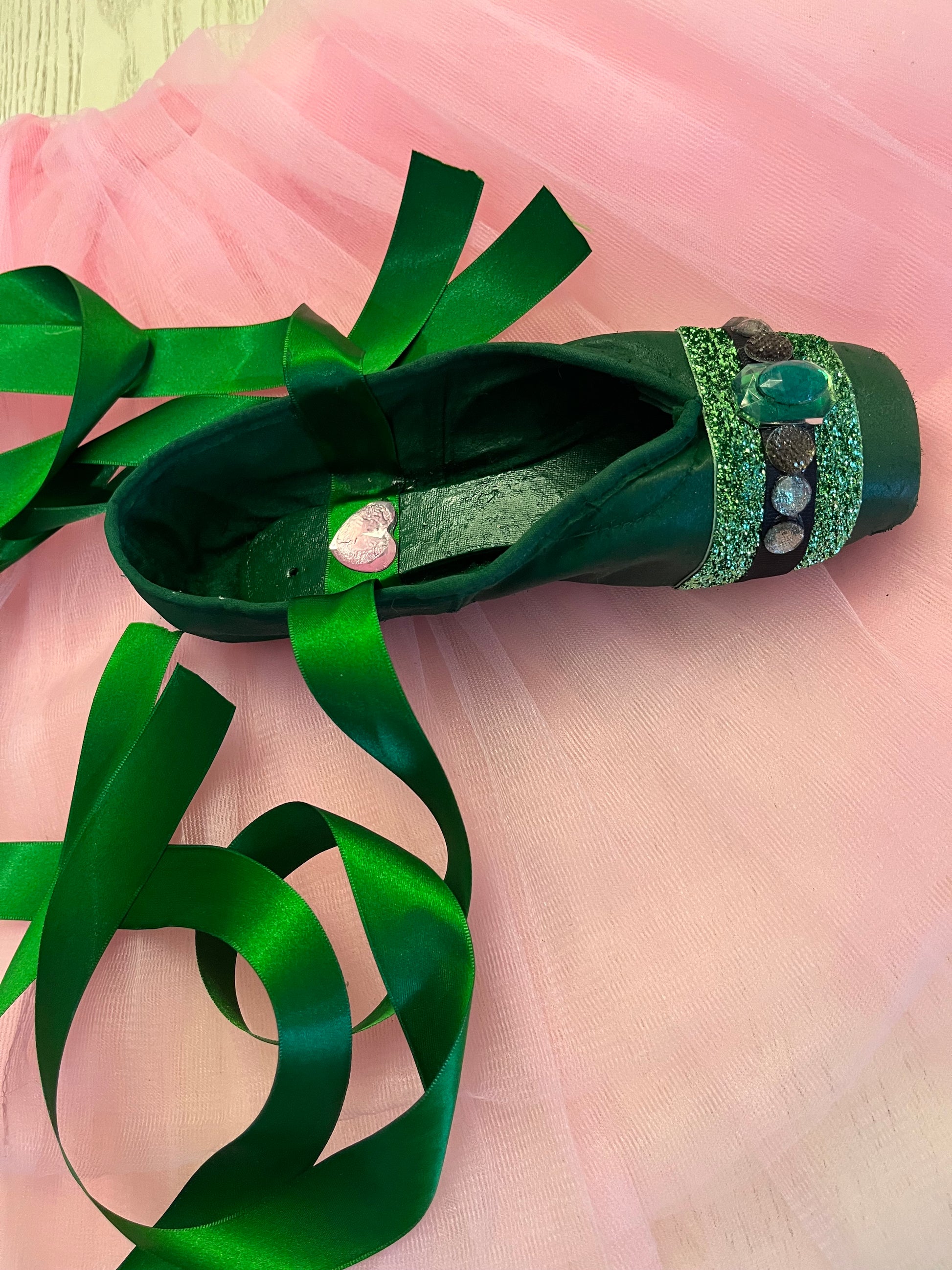 Wickedly Wickeddares to dance in the shadows — a bold satin pointe shoe dressed in rich green hues and encrusted with black jewels that catch the light like secrets waiting to be told. Each gem is affixed by hand, transforming the classic symbol of discipline into an expression of untamed glamour and artistry.